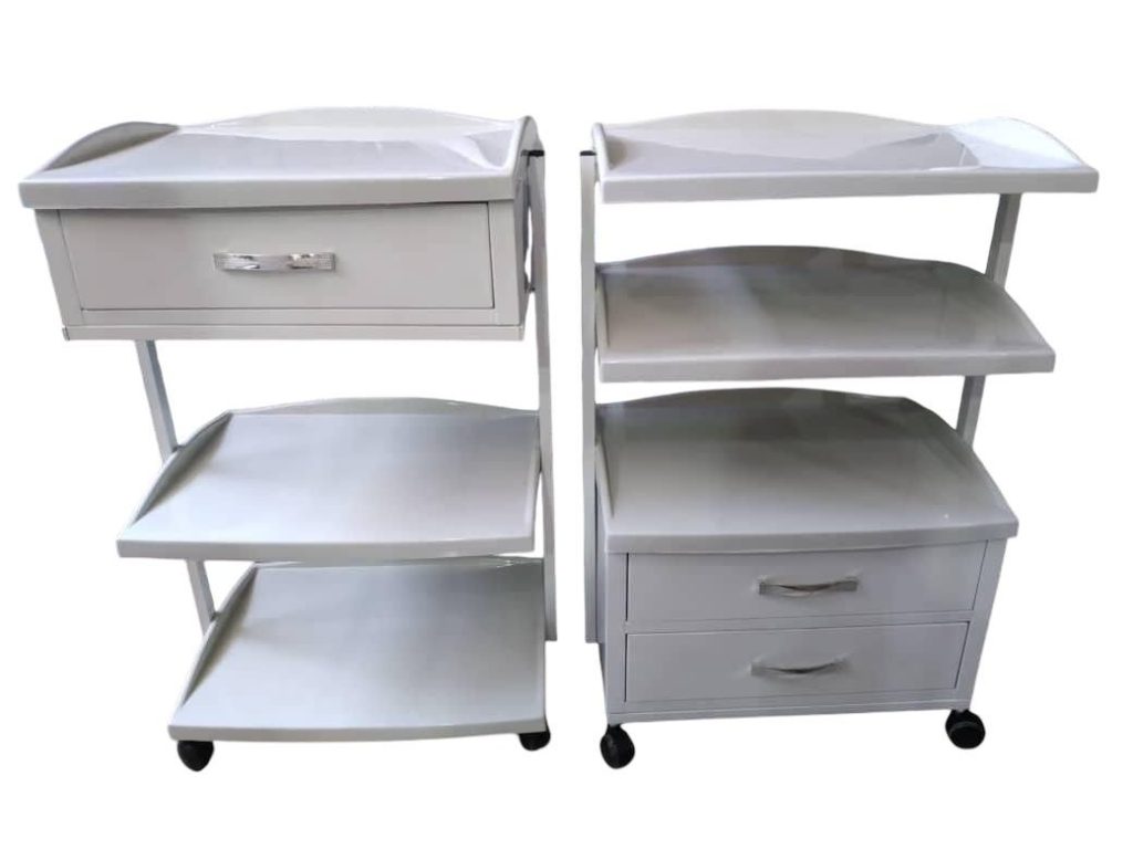 - جنس کشوها: کشوهای هیگلاس به دلیل زیبایی، مقاومت در برابر رطوبت و لکهها، و سهولت در تمیز کردن، انتخاب مناسبی برای ترالیهای زیبایی و دندانپزشکی هستند.